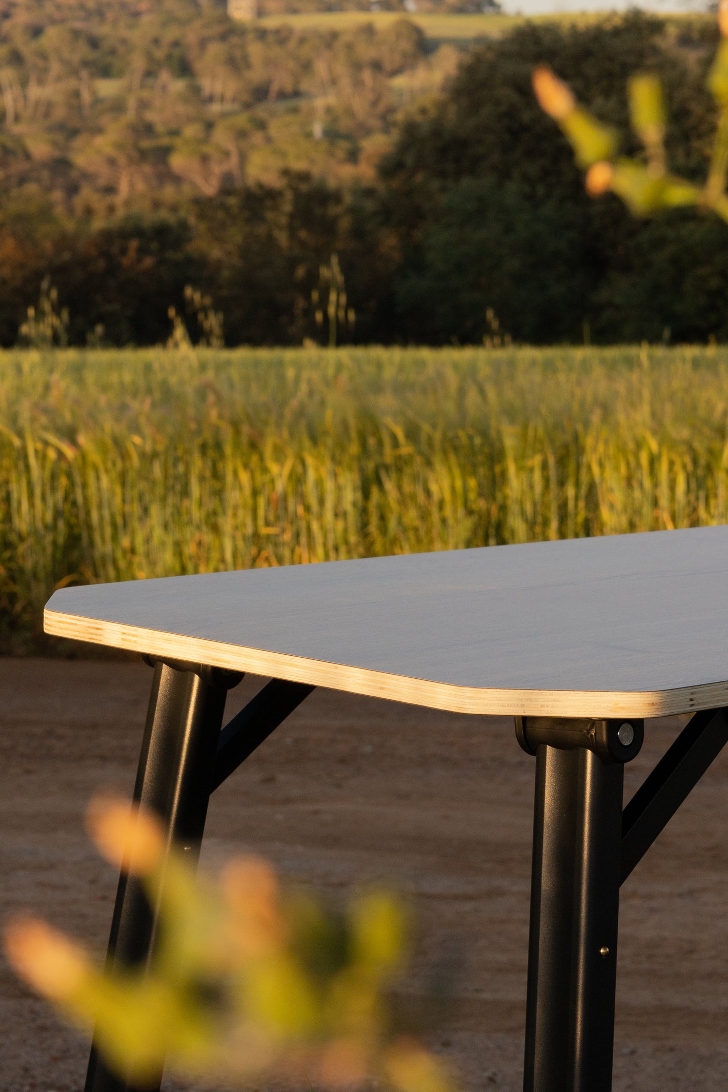The table can be used both inside and outside. The aluminum legs can be leveled, really useful on uneven surfaces.