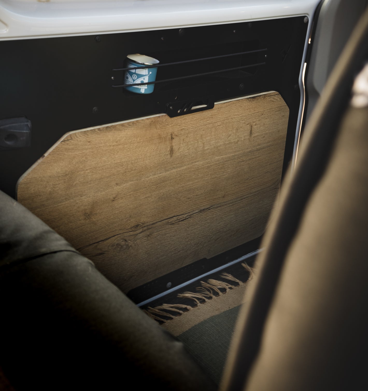 Mounted directly to the inner side of the sliding door, TableKarrier stays completely flush when closed, part of the van’s interior.When you open it, the table folds down in one smooth motion and locks into place.It’s a robust sliding door table, sturdy and perfectly fitted to the door geometry.No extra frames, no noise, and no wasted space.